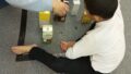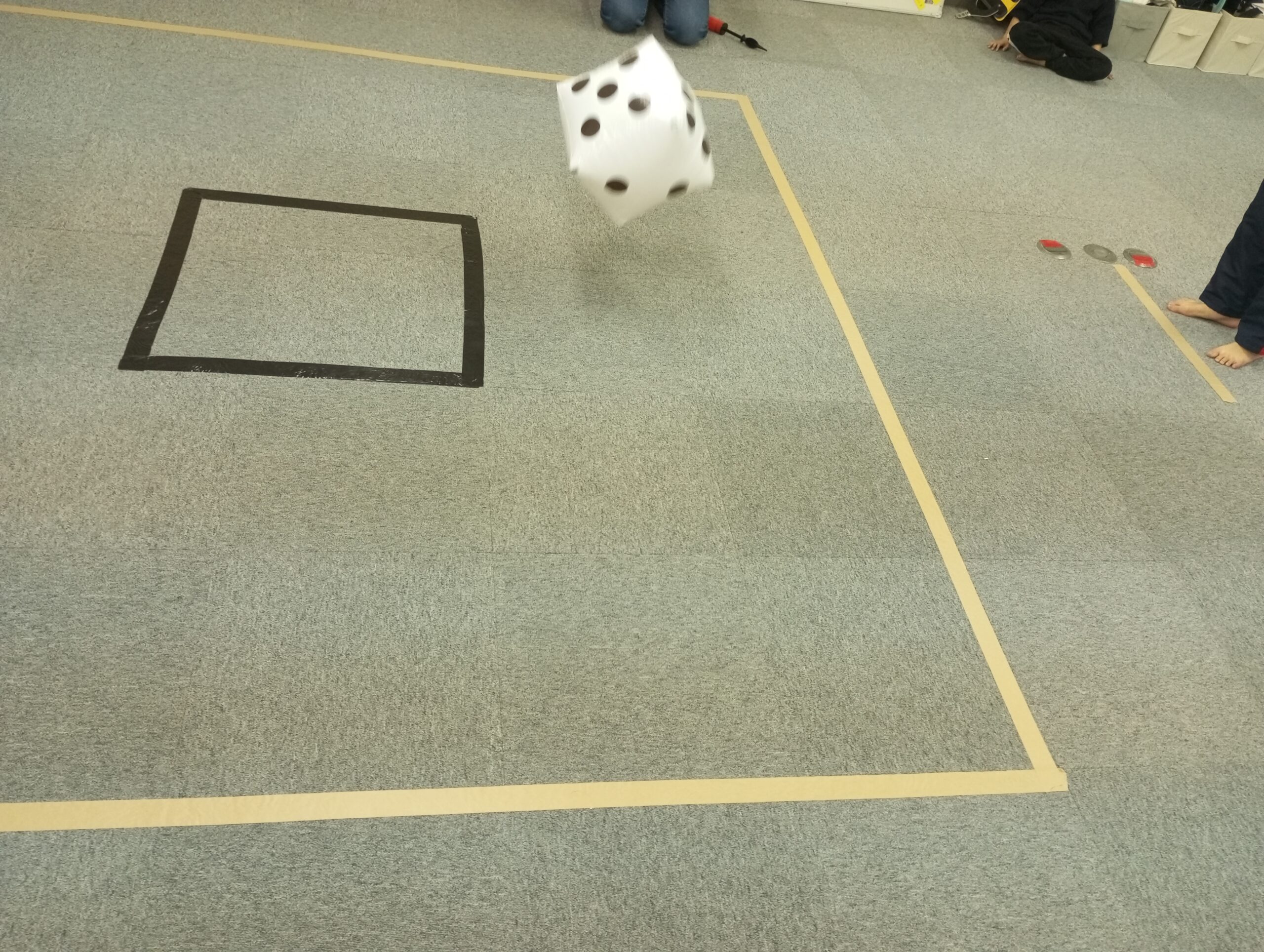 大きなサイコロ🎲を床にテープで作った的に向かって2回投げます。