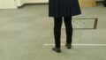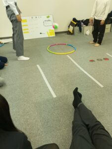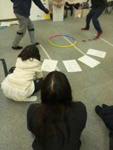 床に置いたフラフープに向かって、「ポンデ」と言いながら持っているボールを投げ、自分の前にボールが飛んで来た子は「リング」と言いながら受け取ります。