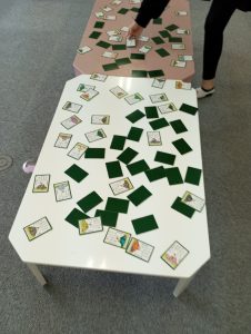 2チームに分かれて、中央に置いてある百人一首を順番にめくっていきます。
