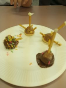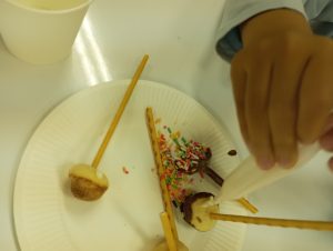 これにチョココーティングとチョコスプレーを付けて、出来上がり。