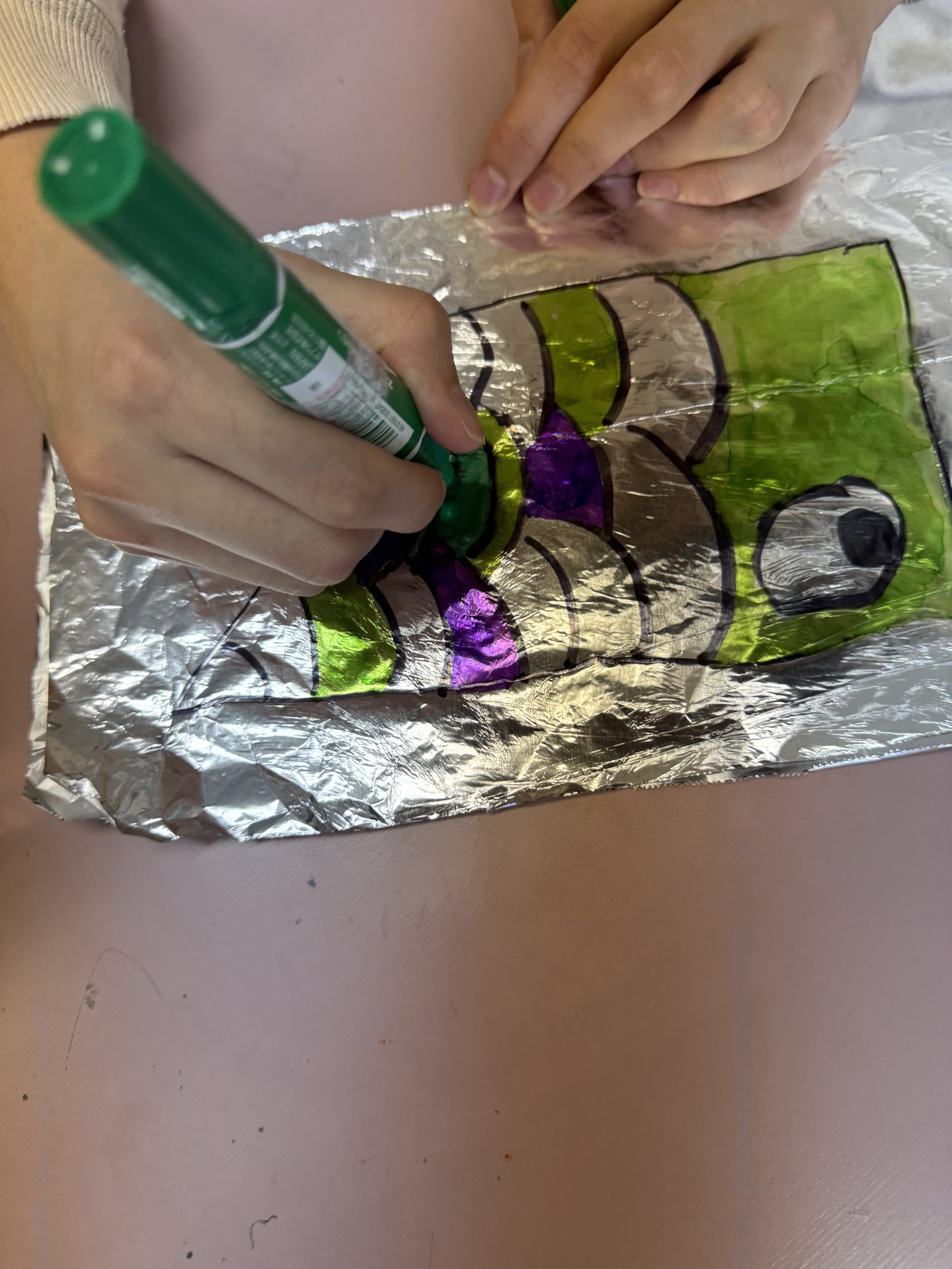 ☆アルミホイルにこいのぼりを書いて、好きなように色を塗ります