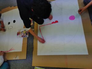 ①グループは、昨日下書きされた鬼と福娘を丁寧に色付けしていきます🎨