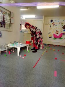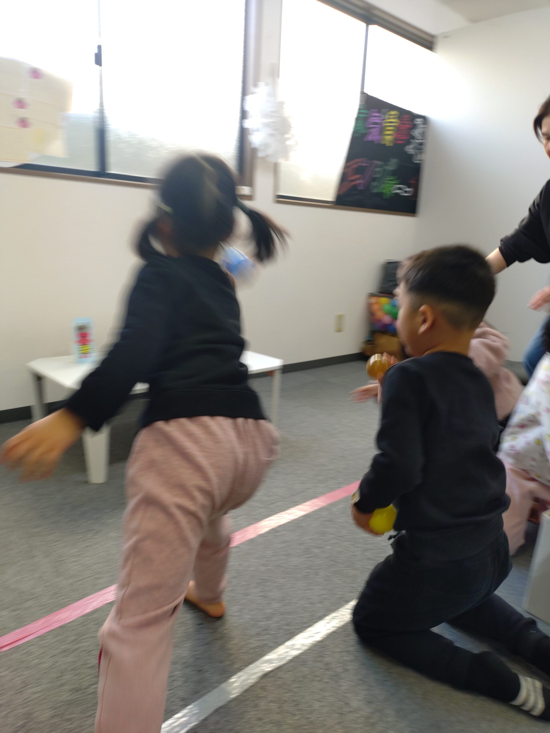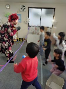 子どもたちはドキドキしているようですが、鬼のタンゴや豆に見立てた玉を使って、鬼の的を倒して過ごしました。