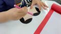 イスとイスの間に ガムテープでスロープを作り 割り箸で キャップを上手く誘導させて イスからイスへ移動します。